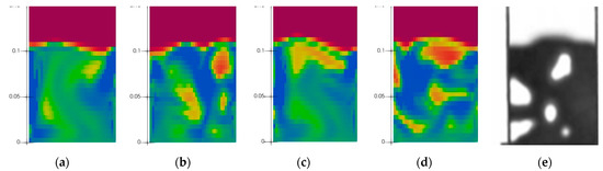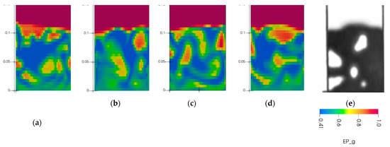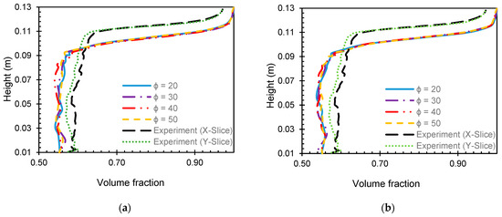 Biomass particles are irregular in shape, and to consider the effects of these irregularities, sphericity is defined and applied to the particle diameter, which results in modeling smaller spherical particles. Considering that particle size has a significant impact on the transitioning between viscous and plastic regimes in a granular system, applying sphericity can change the behavior of the fluidization process. Hence, the value of that dictates the transfer between viscous and plastic regimes can be affected by particle size. To better understand the effects of on the simulation predictions, four values of are tested and the results of these simulations are compared with experimental data [5]. The variation in is visualized in Figure 9 through the void fraction contour plots at 10 s for both RDFs for between 20 and 50, in increments of ten. These changes were only reported for the cases using the Schaeffer model due to the efficacy of the simulation results of the Schaeffer cases reported previously. The experimental data for void fraction were only available against the height of the reactor, which is used to validate simulations in Figure 9a,b. Figure 9 qualitatively illustrates that increasing the value of enlarges the size of the bubbles. For = 20, the bubbles are small and dispersed, while for = 50, the smaller bubbles merge together and form larger bubbles. Considering that none of these two behaviors are the characteristic of the experimental X-Ray of the bed, the intermediate values of of 30 and 40 seem to provide the best results in comparison, where the bubbling within the flow is similar to that of the experimental bed. Regardless of the value of , bubbling behavior predictions of the bed slightly favor the use of the Ma–Ahmadi RDF.