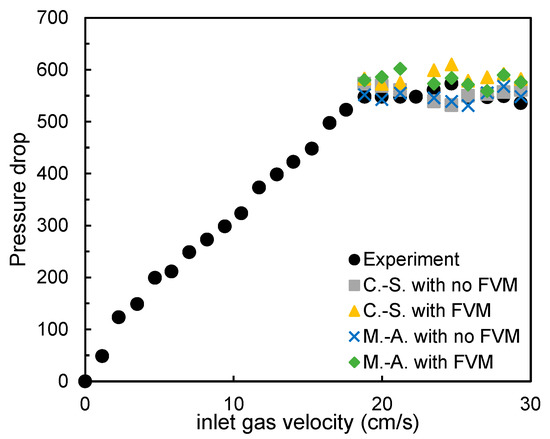 To further investigate the effects of using different RDFs and the effects of applying Schaeffer FVM, pressure drop across the bed is investigated. For Geldart B particles, as the inlet gas velocity increases, the pressure drop across the bed increases linearly until the gas inlet velocity reaches the and the bed is fully fluidized. In the fully fluidized region, the pressure drop remains constant. At the inlet gas velocity, , of 24.3 cm/s, which is the for the rest of this work, the bed is fully fluidized and the fluidization experiments [5] predicted the pressure drop across the bed to be equal to 570 Pa. At the same velocity, simulations predict a very close pressure drop regardless of the utilized models, where the deviation of simulations from experiments is trivial (less than 2%). To further investigate the behavior of models, Figure 5 presents the predicted pressure drops by simulations compared to the experimental results at different ’s. For all ’s, the simulation predictions are in good agreement with experiments. The averaged experimental pressure drop in the fully fluidized region is 551 Pa where the value is 555 Pa and 549 Pa for the Carnahan–Staling and the Ma–Ahmadi RDFs with no FVM, respectively. The error associated with both RDFs is less than 1%. However, the utilization of the Schaeffer FVM increases the error associated with the simulations. The averaged pressure drop is 586 Pa and 580 Pa when employing the Carnahan–Starling and the Ma–Ahmadi RDFs with the Schaeffer FVM, respectively. The error associated with the former is 6.5% and the latter is 5%.