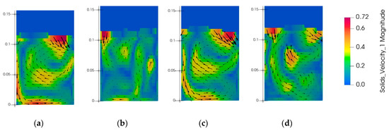 The dynamics of the flow can be estimated by investigating the gas and solid velocity contours. Figure 6 and Figure 7, respectively, contain the gas and solid particle velocity magnitude contours along with the velocity vector at 10 s to better demonstrate the hydrodynamics of the fluidized bed. The use of RDFs with no FVM (Figure 6a,c) predict similar gas flow, where gas velocity is higher near the center of the reactor close to the left wall in the bed and veers toward the right wall in the freeboard region all the way to the top of the reactor, where gas would leave the reactor. Similarly, predictions of solid velocity for both RDFs (Figure 7a,c) exhibit similar patterns, where solid particles experience high velocities near the center of the reactor in the vicinity of the left wall. The high velocity regions are also predicted near the left wall, along with the bed entrance and at the right top corner of the bed. The solid velocity vectors show some rotational movement of solid particles where particles are pulled up in the center of the bed and dragged back down into the bed at the right top corner of the reactor where the solid velocity is the highest. This region is where gas flow leaves the bed and leaves the solid particles behind. Although the solid velocity patterns are similar using the two RDFs, the predicted velocity magnitude at different regions are slightly different.