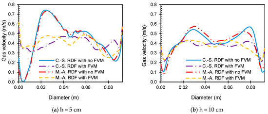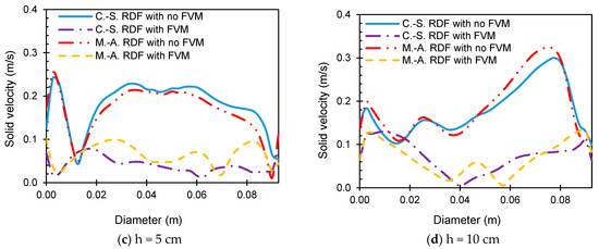 To investigate the effects of using different RDFs and applying FVM more elaborately, Figure 8 illustrates the time-averaged gas and solid velocity magnitude profiles between 2.5 s and 10 s versus the diameter of the reactor. The profiles are presented in two heights, 5 cm and 10 cm, which are the initial bed heights. Regardless of height, the use of the Schaeffer model predicts significantly lower velocity magnitudes almost everywhere along the diameter of the reactor. This is specifically noticeable in solid velocity magnitude predictions (Figure 8c,d), where the average solid velocity magnitudes at both heights are about one-third of the predicted value with no FVM. The use of the model also smooths the velocity magnitude predictions at each height, where no significant overshot or undershot of velocity is predicted. At the lower height (h = 5 cm), the range of predicted gas velocity magnitudes are higher for all models compared to h = 10 cm. This can be attributed to the loss of gas momentum, as gas flows higher through the granular bed of materials.