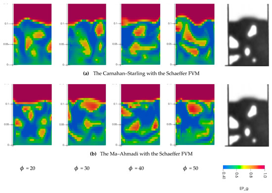 Instantaneous void fraction contours for using different in comparison to experimental data [5], for (a) the Carnahan–Starling with the Schaeffer FVM, and (b) the Ma–Ahmadi with the Schaeffer FVM.