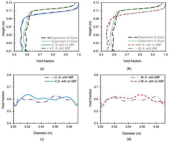 Time-averaged void fraction versus the height averaged over the diameter of the reactor compared with experimental data, reproduced from [5], Journal of Fluid Engineering, for (a) the Carnahan–Starling RDF with and without the SBF, (b) the Ma–Ahmadi RDF with and without the SBF, time-averaged void fraction versus diameter of the reactor at h = 10 cm for (c) the Carnahan–Starling RDF with and without the SBF, (d) the Ma–Ahmadi RDF with and without the SBF. [The Carnahan–Starling RDF with the tanh SBF (dash-dot-line), the Carnahan–Starling RDF with no SBF (solid-line), the Ma–Ahmadi RDF with the tanh SBF (dash-double-dot-line), the Ma–Ahmadi RDF with no SBF (dash-line), experimental x-slice (long-dash-line), and experimental y-slice (dot-line)].