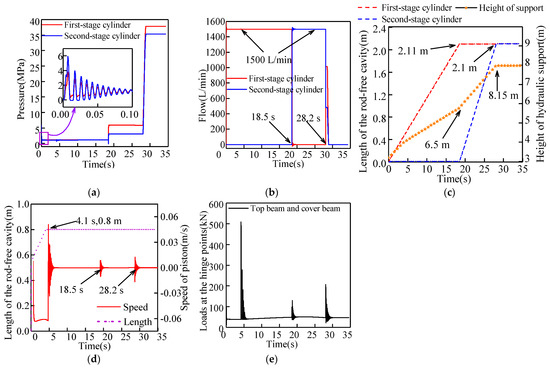 At 28.2 s, the second-stage cylinder reaches the end of the stroke. At this point, the length of the rod-free cavity of the second-stage cylinder becomes 2.1 m, and the height of the hydraulic support reaches about 8.15 m. During 28.2~35 s, the column piston is moved to the end of the stroke, and the height of the hydraulic support does not alter. However, the initial support force of the hydraulic support is not reached, and the lower chamber of the column does not reach the rated pressure of the pumping station. Therefore, there is still a small amount of hydraulic oil entering the lower chamber of the column in a short time. In addition, the pressure also increases and finally stabilizes near the rated pressure of the pumping station. In other words, the pressure of the rod-free cavity of the first-stage cylinder is stable at 37.8 MPa and the rod-free cavity of the second-stage cylinder is stable at 35.3 MPa (once the pressure stabilizes, no hydraulic oil enters the cavity, and the pressure difference between the rod-free cavity of the first-stage and the second-stage cylinder is only the opening pressure of the bottom valve).
