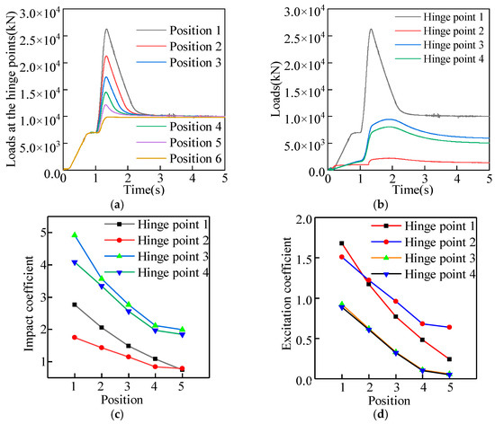 (a) Hinged point 1 load at different rotation positions. (b) Hinged point loads at different positions. (c) Impact coefficient of each hinge point. (d) Excitation coefficient of each hinge point.