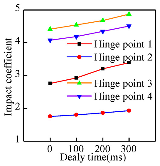 Hydraulic support is a mechanical and hydraulic co-bearing device. The hysteresis effect of the relief valve modifies the hydraulic system’s dynamic response properties and the load transfer law. As the delayed opening time of the relief valve increases, the peak load at hinge point 1 increases from 26,200 kN to 30,667 kN. Then, the load decreases gradually and stabilizes as the relief valve overflows. Due to the delayed effect of the relief valve, the time to reach the stable load at hinge point 1 is delayed correspondingly. According to Figure 15, as the relief valve opening time is extended, the impact coefficient of the hinge points at different locations increases. The trend of the impact coefficient for hinge point 1 is the most pronounced, increasing from 2.79 to 3.39, while the growth rate for hinge point 2 is the smallest, increasing from 1.75 to 1.93. According to the above analysis, the sensitivity of the hinge points to the sudden load at various positions is different for the hysteresis effect of the relief valve. Hinge point 1 is the most sensitive, and hinge point 2 is the least sensitive.
