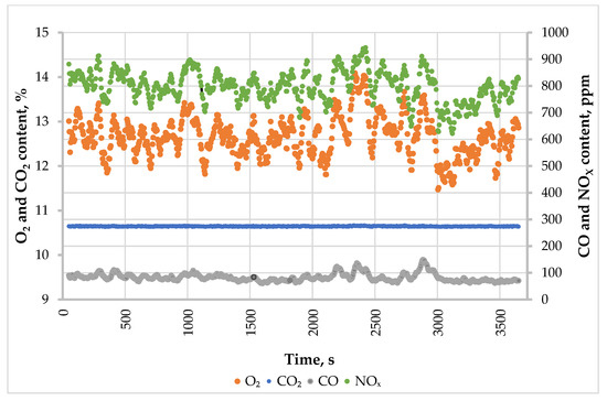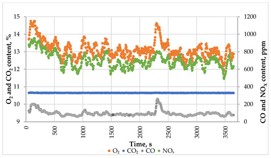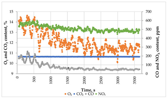 As can be seen in Figure 5, a sudden increase in the content of O2, CO, and NOX was observed. However, in the case of carbon monoxide, fluctuations during the measurements stabilized, which did not occur in the case of O2 and NOX.