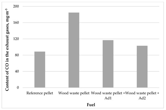 Fuel from wood waste generated significantly higher CO emissions than the reference fuel, but the catalytic additive brought its results closer to those of the reference fuel. The reduction in carbon monoxide emissions is not only important for the safety of the service (given the threat of CO poisoning) but also affects the efficiency of the boiler. Underburned CO increases the loss of incomplete combustion. During the combustion of pellets from plate waste without catalytic additives, the concentration of carbon monoxide was 185 mg·m−3 and was more than twice as high as the concentration seen during the combustion of the reference pellet (89 mg·m−3). The catalytic additives’ application reduced the carbon monoxide emission, and the decrease was 36% for Ad1 and 44% for Ad2.