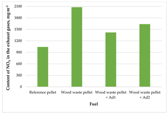The lowest concentration of nitrogen oxides was recorded during the combustion of the reference pellet, and it was about 1040 mg·m−3. Considering the pellets from board waste, this value was about 2 times higher. The use of the DESONOX catalytic additive reduced the NOX emission value. Ad1 reduced nitrogen oxide emissions by 31% and Ad2 by 21%.