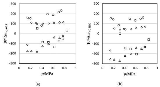 On the other hand, the deviations of the experimental values from both equations of state, as can be seen in Figure 2, shown a similar trend. However, the AGA8-DC92 equation gives a maximum positive deviation of 243 parts in 106 for the “raw biogas” mixture at the highest pressure versus a maximum positive deviation of 161 parts in 106 from GERG-2008 predictions for the same mixture under the same pressure. In terms of negative deviations, the extreme values of deviations are −269 parts in 106 from GERG-2008 for the “washed biogas” at p ~ 0.3 MPa and T = 325 K and −205 parts in 106 from AGA8-DC92 for the “biomethane” sample at p ~ 0.6 MPa and T = 325 K.