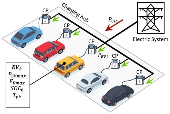 The reference scenario object of the study is a generic CH within a car park in which the EV parking lots present a charging point as sketched in Figure 1. EV users can arrive at the CH and depart it at different times of the day.