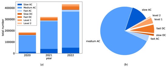 The number of charging stations has grown in the past three years, the year 2022 also confirms this growing trend. Figure 2a (data retrieved from []) shows a strong increase in AC charging points belonging to the “medium-speed AC” category. The figure also shows that the main increase in the DC category is related to “fast DC” and “ultra-fast DC”—Level 1 systems. Currently, 88% of the CPs in the EU belong to the AC category. The pie-plot in Figure 2b shows that 73% of CPs provide power between and followed by 11% of CPs having a power rating lower than . The DC charging category only provides 11% of the total number of CPs. Most DC CPs have a power rating between and (5.5%), followed by ultra-fast charging—Level 1 (3.8%).