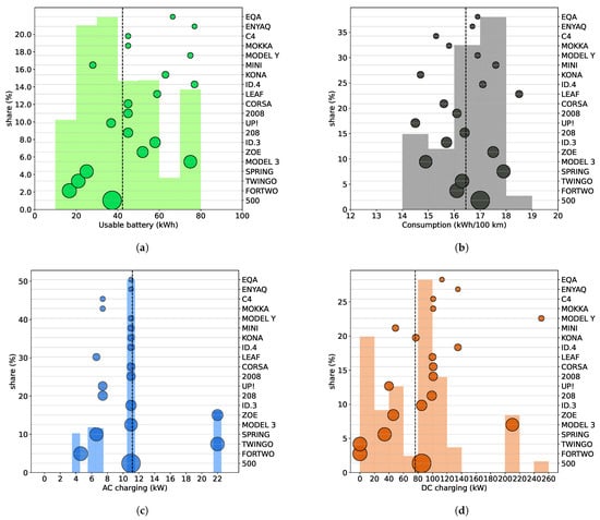The different graphs of Figure 3 summarize the characteristics of the 20 best-selling EV models in Italy. Specifically, the abscissa represents the variation range of some features for the EV population considered: the usable battery capacity (a), the specific consumption in terms of (b), the AC charging (c) and DC charging (d) power capability. The scatter plot depicts the feature value for each EV model indicated in the y-axis. The markers’ size is proportional to the share of the model on the total number of registered EVs. The histograms, referred to the left-axes, depict the distribution of the corresponding features among the population. The specific consumption data are referred to the world harmonized light-duty vehicles test procedure (WLTP) declared by manufacturers []. The reported vehicles represent 90% of the whole registrations in Italy in 2021. Since some of these models have different options for battery capacity and engine size, only the characteristics of the most popular models are considered for the sake of analysis simplification. Finally, the vertical dashed line depicts the average values.