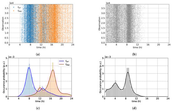 Working place parking lot scenario: (a) arrival and departure time of users; (b) parking time of the users; (c) probability density function of arrivals and departures; (d) probability density function of the parking duration.