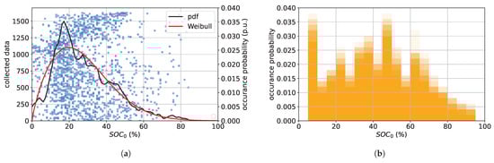Previous works proposed two different approaches. In [] a statistical model based on real-world data is proposed. A three-month data collection campaign was conducted on an electric car-sharing fleet. The car-sharing fleet under study is entirely composed of Renault ZOE. The EV charging is entrusted to operators that monitor the SOC and the location of each vehicle. When the SOC drops below a certain “alert” level, an operator drives the EV toward a charging hub to recharge its battery. It is essential to point out that this operation is not based on rigid procedures. Indeed, an operator is left free to bring a vehicle to the charging hub even if the vehicle’s battery does not strictly need to be recharged, or the SOC value is quite below the alert level. The human decision variable along with the different distances of the vehicles from the charging hub introduce some level of randomness and data variance in the population. Figure 6a shows the collected data, their probability distribution, and the approximation obtained through a Weibull function.