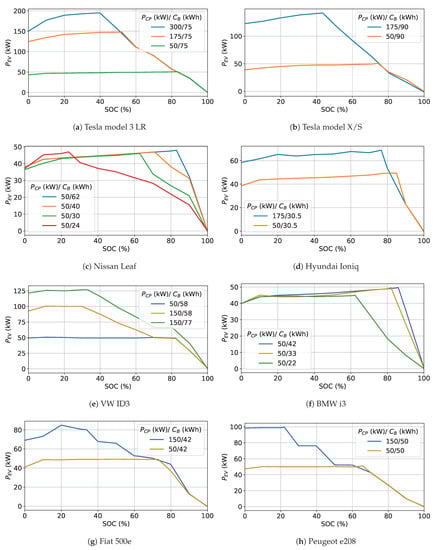 – profiles at different C-rate for different EV models. The figure legend reports the power rating of the charging station () on which the test is performed, and the battery capacity of the EV model.