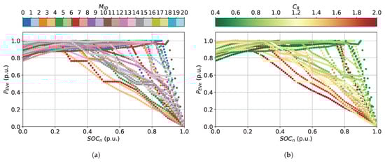 The training of the model is obtained starting from the measured charging profiles retrieved from []. The EV charging profiles (such as the curves reported in Figure 7) are collected and sampled to create the main data frame. Thus, for each punctual value of SOC, the value of is registered. The data are normalized as a function of the peak power value of the charging profile. The same process is carried out to the SOC in order to have normalized values, i.e., (, ) . Each pair (, ) is matched with the vehicle model identification number () and the corresponding value. The output of data pre-processing consists of a data frame in which each sampling observation is organized into four columns containing the label, i.e., , and the features , , and . Figure 8 shows the output of the above-described data processing. Figure 8a shows the curves colored as a function of . On the other hand, Figure 8b shows the curves colored as a function of .