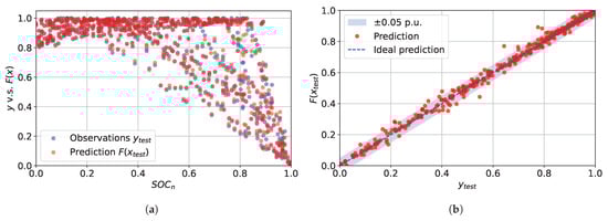 An initial qualitative evaluation of the model’s performance can be taken graphically from Figure 9. The figure compares the actual observation of the test label (blue markers) with respect to its predictions (red markers). Figure 9a provides the comparison as a function of the feature. It appears that the predictions are able to overlap adequately well with the observed samples. Finally, Figure 9b provides an evaluation of the residuals. The blue dashed line depicts the ideal zero-error prediction and the light-blue area represents a 5% error zone. It can be seen from Figure 9b that most of the values overlap the dashed line and remain within the light-blue zone.
