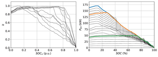 Introducing the machine learning predictive model in Equation (6), it is possible to recreate the profile of for each value of SOC, C-rate, and vehicle model through Equation (5). Figure 10 shows, as an example, the results obtained considering the Tesla Model 3 RP (from the list). The left plots show the k value as a function of the SOC as the C-rate increases (i.e., increases). The right plots show the corresponding power–SOC profile computed via Equation (5) (dashed black lines). The colored markers in the figure represent the starting measured data from which the model was trained.