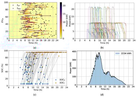 Results of the proposed algorithm considering N = 100, = 22 kW, = “AC”, and S = “working”: (a) arrival and departure times and heat map of the power ; (b) plot of of each EV; (c) , and SOC evolution as a function of time; (d) profile of and corresponding energy (kWh).