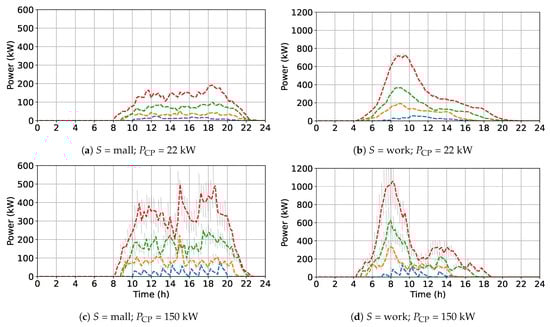 Figure 13 and Figure 14 show some preliminary results. The figures represent the daily power profiles (24-h time window) for 4 different scenarios as the charging points’ power and the number of daily users change. The gray lines depict (with a 1-min resolution). The dashed colored lines depict the moving average whose color is a function of the N-setting. The selected for Figure 13 and Figure 14 are (that is the upper limit of the most common AC-charging level) and (that is the upper limit of the most common DC category).