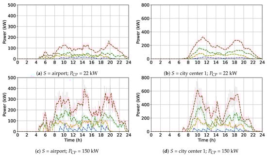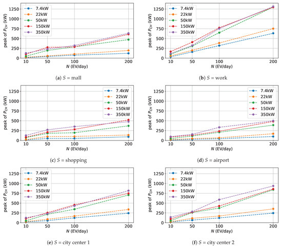 On the other hand, results show that there is no direct proportionality between the peak power and the power rating available at the charging points. For example, let refer to the case in Figure 16e which considers the “city center 1” scenario. The greatest increase in peak power occurs at the transition from to . Thereafter, tripling the CP power does not imply a noticeable increase in peak power. Moreover, in almost all the scenarios analyzed, from Fast to Ultra-fast CPs, the peak power variation is very slight in comparison to the variation. This is mainly due to the few numbers of EVs having a charging capability above among the total population (as reported in Figure 3). This means that currently, for the same number of daily users and available CPs, the contracted power of a CH that has CPs could potentially be similar to a CH that has CPs.
