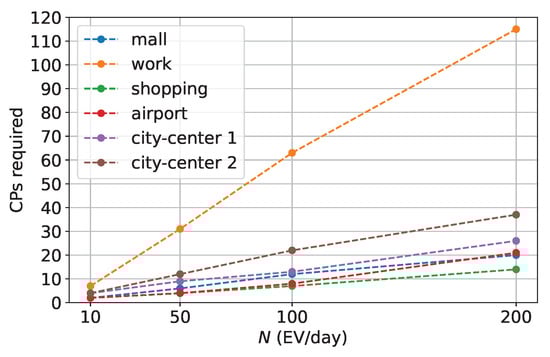 Finally, Table 6 shows the summary of the analysis carried out in this section. The table compares the scenarios considering N = 100 users per day. For each scenario, the table reports the number of CPs needed to ensure connection to each EV in the fleet, the CP power rating suggested to avoid over-sizing and ensure an adequate , the peak value of the CH power, and the average energy supplied per user.