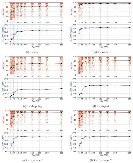 Analysis of the results showed marked differences between the power profiles of the scenarios analyzed. CH located in a working place scenario requires more CPs to satisfy the same number of users per day compared to other urban scenarios. On the other hand, AC charging points are sufficient to meet the energy demand of the entire fleet. In fact, the results proven that DC chargers do not introduce significant improvements. The other urban scenarios, which have a lower probability of simultaneous user connection, require fewer CPs for the same number of daily charging events. However, due to the shorter parking times, fast DC CPs are needed to ensure an adequate energy supply. In this case, rated powers between and are sufficient to meet fleet energy demand. In general, considering the characteristics of the current EV population and the typical parking times of urban scenarios, the proposed method showed that the use of ultra-fast (i.e., ) charging points produces no increase in average energy delivered. Similar considerations can be made regarding the SOC level of vehicles at the end of charging and the total peak power.