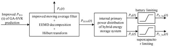 The upper limiting control primarily includes the EEMD decomposition module, the primary power distribution module, and the limiting module. The result predicted by the improved GA-SVR model at t~t + T time is taken as the wind power output, and the PHESS(t) is obtained after the improved moving average filter. The appropriate frequency division frequency is determined by the time spectrum obtained by EEMD decomposition and Hilbert transform, and the high- and low-frequency components are reconstructed to determine the initial reference power of the battery and supercapacitor. The structure diagram of the upper limiting control is shown in Figure 4.