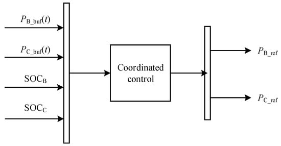 It is stipulated that when the hybrid energy storage system is in normal operation, the charge and discharge power instructions of the storage battery and supercapacitor are PB1 and PC1, respectively, as shown in Equation (8). When the hybrid energy storage system is in a coordinated operation, the charge and discharge power instructions of the battery and supercapacitor are P2 and P3, respectively, as shown in Equations (9) and (10). When the battery and supercapacitor are in a state of stopping operation, it is indicated by 0. The structure diagram of the lower coordinated control is shown in Figure 5. The results of the secondary adjustment of the output of each energy storage element after coordinated control are shown in Appendix C.