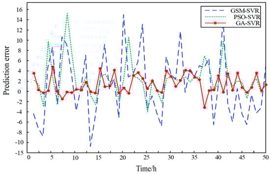 In order to verify the optimization effect of the proposed method, the optimization of SVR parameters by the grid search method (GSM-SVR) [], the optimization of SVR parameters by Particle Swarm Optimization (PSO-SVR) [], and the optimization of SVR parameters by the genetic algorithm (GA-SVR) [] are compared and analyzed. The respective prediction errors are shown in Figure 6. It is obvious that GA-SVR has good prediction performance, higher accuracy, and minimum prediction error.