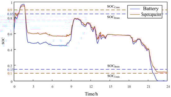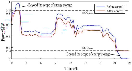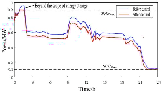 First of all, the SOC of each energy storage element before and after control is simulated. Figure 7 provides the charge state curve of the storage battery and the supercapacitor. Evidently, the SOC of the two energy storage media exceeds the upper and lower limits many times between 0~3 h and 21~24 h, which causes great damage to the elements and shortens their life. Evidently, when using the energy storage system to stabilize the fluctuation of the output power of the wind farm, the charge and discharge process of the energy storage equipment fluctuates. If the capacity of the energy storage element and the rated operating power are not taken into account, the problem of SOC exceeding the limit and overcharging and discharging may occur in actual operation.