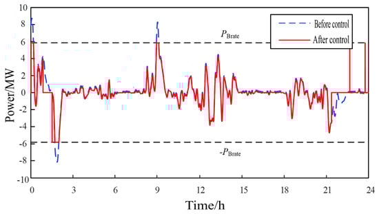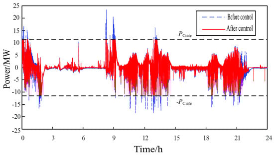 At the same time, the internal power optimization of the energy storage system can be realized by hierarchical control. The charge and discharge power curves of the two energy storage devices before and after hierarchical control optimization are compared, as shown in Figure 10 and Figure 11. Obviously, the charge and discharge power of the storage battery and supercapacitor is lower than that before control, and there is no over-limit trend, which ensures that the operating power of the storage battery and the supercapacitor does not exceed its rated operating power. In addition, the number of charges and discharges has also been reduced, which implies that the service life of the energy storage system can be extended.