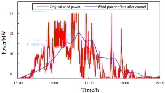 Similarly, in this example, the whole-day output active power of a wind farm with an installed capacity of 30 MW is selected as the simulation data, and the wind power output stabilization effect with or without hierarchical control is compared during the time period of 15:00~19:00 in a day, as shown in Figure 12 and Figure 13 and Table 2.