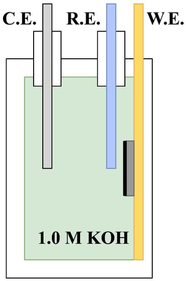 Deionised water and an appropriate quantity of potassium hydroxide (powder) for synthesis (Sigma Aldrich) were combined to create the 1.0 M KOH electrolyte, which was thoroughly hand-stirred to ensure a homogeneous concentration. The three-electrode setup was left to settle to establish a steady state by allowing the electrolyte to completely permeate all cavities of the nickel foam electrode.