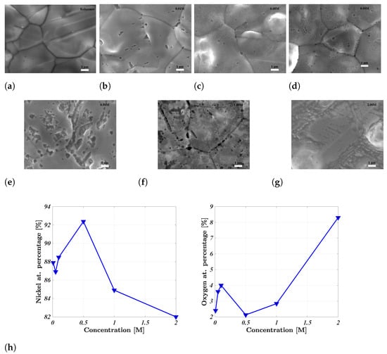 The effect of acid washing was ascertained through scanning electron microscopy (SEM), energy-dispersive X-ray spectroscopy (EDS), and X-ray diffraction (XRD). The effects of acid washing for increasingly potent concentrations of sulphuric acid are illustrated in Figure 2. The change in surface morphology is clear when comparing the pristine reference nickel foam in Figure 2a to the surfaces shown in Figure 2b–g. The reference nickel foam in Figure 2a presents a uniform surface with little influence of indentations, cracks or crevices. Pitting corrosion is immediately registered for the weak acid concentration of 0.01 M H2SO4, while any influence of uniform corrosion is not clear until the concentration is increased to 0.05 M. The degree of uniform corrosion increased together with the influence of pitting corrosion as the acid concentration was elevated, ultimately yielding surfaces where the visibility of the grain boundaries is notably reduced, as seen for 2.0 M H2SO4 in Figure 2g. The degree of uniform surface corrosion decreased the influence of pitting corrosion due to its severity.