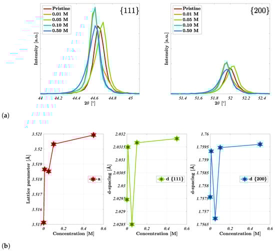 Shown in Figure 3a are the XRD spectra for select concentrations of the acid-treated nickel foam electrodes. The electrodes presented a singular cubic phase, fm-3m, where the highlighted peaks were affiliated with the 111 and 200 facets of nickel foam at 44.61–44.69° and 51.96–52.07°, respectively (JCPDS No. 87-0712) [31]. It is likely that the minor variation in peak position (0.08–0.11°) for the 0.05 M sample originated from height variations during sample mounting due to the porous nature of the nickel foam electrodes. It is clear that the width of these peaks has increased slightly with acid concentration, likely due to a decline in crystallinity owing to the formation of surface oxides during the acid washing [21,22]. A decline in crystallinity has been previously reported for HCl-treated nickel foam due to the formation of a NiO layer [21,22], where this has been noted through a gradual increment in peak width and confirmed through Raman and X-ray photoelectron spectroscopy spectra. The peaks were fitted to allow the extraction of the lattice parameters and d-spaces for the two peaks, as shown in Figure 3b. Both the lattice parameter a and the d-spacing slightly increased with increasing acid concentration. The increase in the lattice parameter a followed the same trend as that of the nickel and oxygen at.%. The change in the lattice parameter and d-spacing is likely affiliated with the aforementioned decline in crystallinity, and this would likely increase further as the acid concentration exceeded 0.50 M [21,22]. Greater lattice parameters have been affiliated with increased lattice distortion [32], where this may be due to the nickel oxide layer formed during the acid washing.
