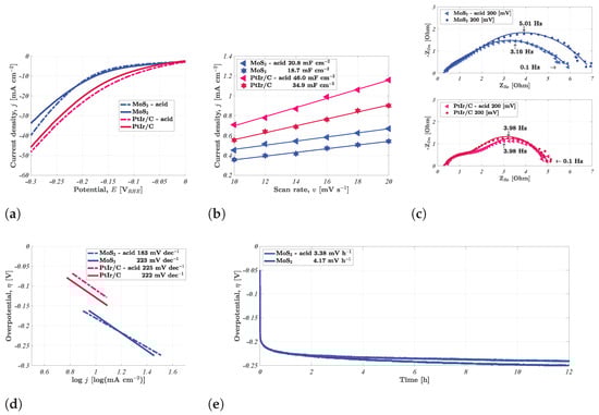 Predictably enough, normalising the current density for the electrochemically active surface area (ECSA) revealed that the acid treatment did not notably enhance the intrinsic activity of the catalyst layer, as shown in Figure S5a. The purpose of the acid treatment was to decrease the prevalence of organic contaminants, reduce the surface oxide layer, and increase the ECSA. While there was little indication of a change in the surface oxide layer based on the series resistance shown in the polarised EIS spectra in Figure 4c, there was a clear indication of a greater ECSA, as shown by the fitted EIS curves. The EIS curves were fitted to an equivalent circuit that was typical for the HER (Figure S5c), i.e., corresponding to a faradaic reaction with one adsorbed intermediate [33]. A comparison of the double-layer capacitance from the EIS fitting revealed similar effects to those revealed by the CV scans, as shown in Table S1. The MoS2-coated acid-treated electrode displayed a fair improvement with respect to the charge transfer resistance, amounting to a 14.3% reduction. This displayed that, while the series resistance was similar, a performance increment was still achieved by reducing the charge transfer resistance. This adhered to established trends in prior research [26] where acid treatment reduced the series resistance, though the decline in charge transfer resistance was greater. Both versions of the PtIr(1:3)/C-coated electrodes displayed similar total impedance spectra, though there was a slight change in capacitance, which correlated with the 31.8% improvement in Cdl.