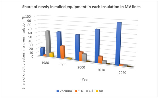 The most common adaptation of circuit breakers for more than four decades has been vacuum circuit-breakers [15,16]. This solution is nowadays widely used in various types of power systems. They are famous for their long service life and functionality and, above all, for their lack of negative environmental impact, which is extremely important in the context of an ongoing environmental policy. They provide a higher degree of reliability compared to air circuit breakers. Due to the fact that there is no ionizing agent and only the contact material is present, vacuum circuit breakers are characterized by low arc energy. The arc is extinguished already at a distance between contacts of 2–3 mm (typically 10 mm for MV networks). Near the point where the current passes zero, the discharge can no longer be maintained by the arc energy and the arc is extinguished.