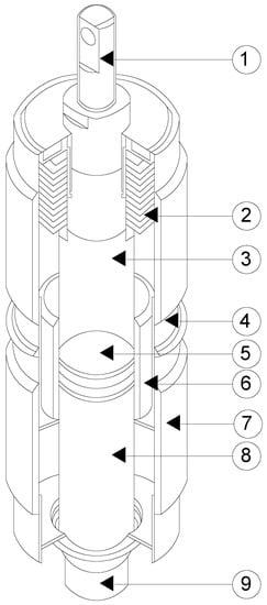 Cross-section of an example vacuum chamber: 1—place of connection to the movable contact, 2—spring bellows, 3—moving pole, 4—ceramic part of the housing, 5—WCu contact, 6—condensation screen, 7—glass part of housing, 8—stationary pole, 9—place of connection to stationary contact.