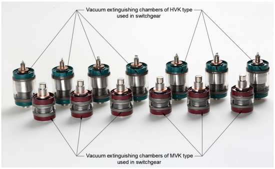 A fundamental component of vacuum insulated switchgear are vacuum extinguishing chambers. They are responsible for providing a safe insulation gap in the contact space. The current path is located inside the ceramic or glass enclosure from which the chamber is made. For minimizing contact pad wear during switching operations, the material and shape of the contacts are selected already during the design phase. The use of a resilient bellows, which guarantees the tightness of the system, makes it possible for one of the contacts to move. The chamber contains a condensation screen on which conductive particles are deposited from arcing discharges occurring between contacts. This element is required because conductive particles that have settled on the chamber housing can weaken the dielectric. Vacuum chambers are made with advanced technology which requires the use of unique materials that can withstand pressure differences and mechanical shocks. The pressure inside the extinguishing chamber is typically 10−4 Pa [46]. Figure 2 shows a cross-sectional view a sample extinguishing chamber [47,48], while Figure 3 shows selected models of vacuum chambers made by the Tele and Radio Research Network’s Łukasiewicz Institute.