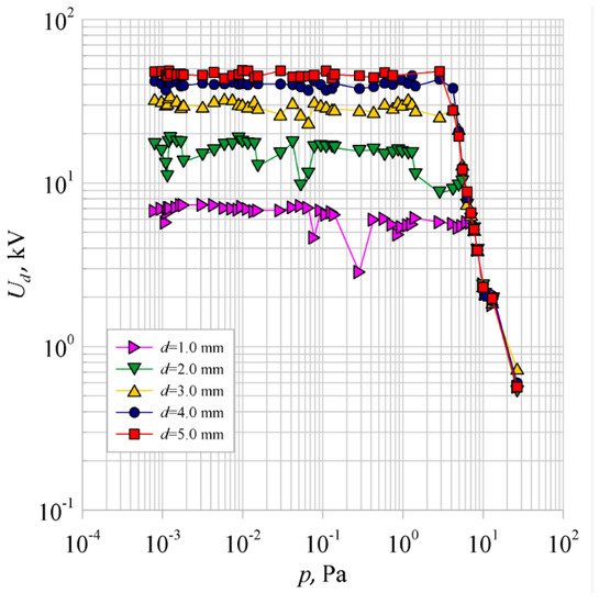 The control of the pressure level in gas-insulated apparatus is extremely important, as the vacuum retains its excellent insulating properties only up to a pressure level of 1 Pa, once the pressure increases beyond this value the breakdown voltage of the insulating gap drops dramatically [50,51,52]. This situation is shown in Figure 4 [18,53].
