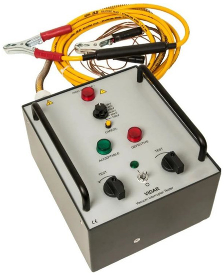 Producers of test and diagnostic equipment for vacuum devices consider the static DC ignition voltage method to be the best method for determining instrument pressure [36]. This method involves applying a voltage of a certain value to the device and measuring a current, the value of which should not exceed 30 mA. From this, it can only be determined whether the device is operational or not. Unfortunately, the static DC ignition voltage method can be skewed by conditioning discharges, and the measurement accuracy itself is also unsatisfactory [54]. A device using this method is the Vidar vacuum chamber tester presented in Figure 5.