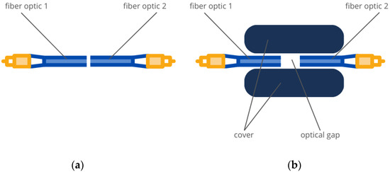 Technology progress has allowed the use of fiber optics as a material for the manufacture of FP sensors. The design of FP interferometers differs depending on the place of use, i.e., for indoor sensors a technology is used where the fiber itself fills the space of the transparent medium (a), while for outdoor designs an air gap or other materials different from the fiber are used (b). The optical gap design for both cases is shown in Figure 8.