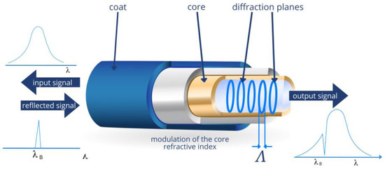 Fiber optic Bragg gratings have gained widespread use in pressure sensing systems, as reflected in many scientific papers. An optical Bragg grating is a periodic structure with a variable refractive index formed in the core of an optical fiber by treating it with UV light. The operation of the grating can be likened to that of a band-stop filter in the transmission operating state [96]. The structure, with its variable refractive parameter, reflects specific wavelengths that do not differ from the wavelengths for the Bragg resonance, and transmits the others without interfering with the passing signal. A schematic of a fiber-optic Bragg grating is shown in Figure 9.