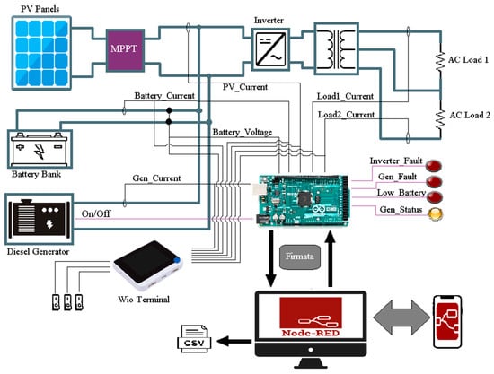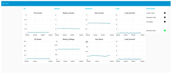 In Algorithm 1, Arduino receives data from sensors and sends all values to MTU using the Firmata protocol via serial communication. Node-Red receives data and calculates PV power and generator power values using other parameters. It then displays all the calculated values and stores them in a CSV file. While displaying and storing files, Node-Red produces three alert signals and one controlling signal, including inverter fault, generator fault, low battery, and generator status signals, respectively. If the battery voltage exceeds 14 V, it turns the generator off; otherwise, it keeps it on. To produce a generator fault check signal, Node-Red checked the generator status signal and the generator output current value. If the generator status signal is on but there is no current, or if the generator status signal is off but the generator output signal is not zero, Node-Red turns the generator fault check light on; otherwise, it keeps it off. In order to generate the inverter fault check signals, the Node-Red server checks the battery voltage and the load current, assuming that the load is on. If the battery voltage is not zero and the load currents are zero, it turns the invertor fault check light on. By checking the battery voltage and determining that it is below 11 V at a certain level, it turns the low battery check light on. If no data are received from Arduino, Node-Red tries to connect after 5 s until it gets any signal, at which point it resumes the whole procedure.