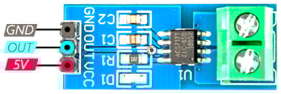 Allegro MicroSystems, LLC is the manufacturer and supplier of this fully integrated, low-cost current sensor, as depicted in Figure 2. The sensor operates on the Hall effect principle. This work uses a 30 A DC module with an output sensitivity of 66 to 185 mV/A and runs on a single 5 V source. The current running via the copper conductivity line creates a magnetic field when this 5 V supply voltage is provided, which the Hall IC subsequently transforms into a proportional output voltage. The specifications of the ACS712 are listed in Table 1 [27].