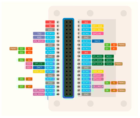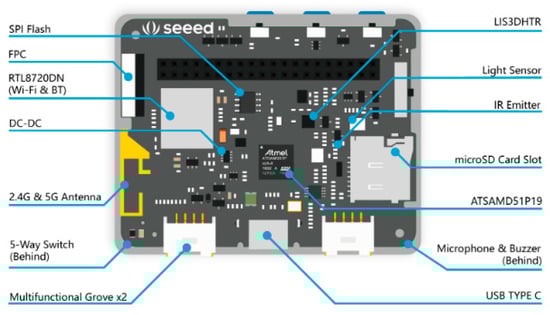 Figure 5 shows the Wio terminal, which is an Arduino and MicroPython compatible SAMD51-based microcontroller with built-in wireless connectivity powered by Realtek RTL8720DN. It has 192 KB RAM, 4 MB External Flash, and 120 MHz (boost up to 200 MHz) of processing speed. This terminal provides a foundation for IoT applications with support for Bluetooth and Wi-Fi. A 2.4” LCD screen, an inbuilt IMU (LIS3DHTR), a microphone, a buzzer, a microSD card slot, a light sensor, and an infrared emitter are all included with the Wio terminal (IR 940 nm). Additionally, it includes 40 Raspberry Pi compatible pins for GPIO and two multipurpose Grove connectors for the Grove Ecosystem, allowing for additional add-ons [29]. Table 4 illustrates the specifications of the Wio terminal. In Figure 6, we have shown an overview of the hardware of the Wio terminal, and the RPI pinout of the Wio terminal is depicted in Figure 7.