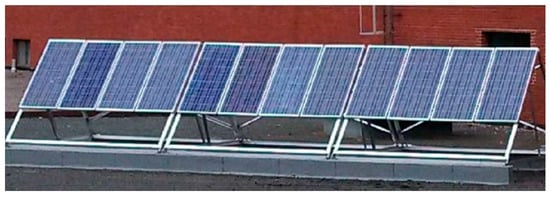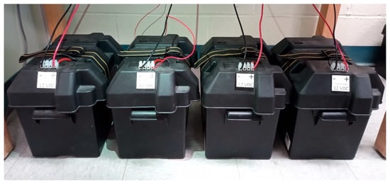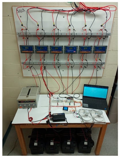 The experimental setup of the proposed system is illustrated in Figure 8. The hardware components discussed earlier were used to implement the system. Figure 9 illustrates the hardware configuration of the proposed system. A DC power supply as well as the DC diesel generator were installed. Figure 10 depicts the battery bank as an energy storage system. Moreover, there was an MPPT panel powered by rooftop PV panels (Figure 11). It consisted of a 130 W, 12 V solar module that is able to generate 20 A of current on a sunny day. The outputs of the solar panel, the battery bank, and the power supply were connected to the DC bus as well as the DC/AC inverter input. A 200 W Sunforce DC/AC inverter was implemented to convert the DC voltage to AC voltage properly. There were two 40 W 120 V AC light bulbs connected to the AC bus as the load. As shown in Figure 9, the Battery Voltage Sensor (BVS), Battery Current Sensor (BCS), PV Current Sensor (PCS), Generator Current Sensor (GCS), Load Current Sensor 1 (LCS1), and Load Current Sensor 2 (LCS2) were implemented to measure the mentioned values and send them to RTUs.