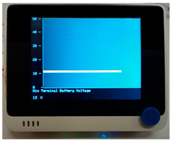 All sensors were connected to the Wio terminal ports. Since there are 9 GPIOs, six ports were allocated to the six sensors, and three ports were assigned to the three commanding ports as the Wio terminal has one screen. Therefore, in order to display each sensor value individually, three command ports were specified. In Algorithm 2, the procedure for receiving data from sensors and commanding ports was discussed. Moreover, the analysis, selection modes, display setup, calculations, and visualization were illustrated. The Wio terminal has nine input pins, as illustrated in Figure 7. Six of these input pins, which are A0, A1, A2, A3, A4, and A5, were connected to the six sensors used in this study, which are battery voltage, battery current, PV current, generator current, load current 1, and load current 2. Similar to the Node-Red algorithm, PV power and generator power are calculated by the Wio terminal. Moreover, the last three pins, which are D6, D7, and D8, were allocated to three command switches to select one of the eight selecting modes to display the eight values. By connecting the three commanding signals to the ground and to 5 V ports, the user can select the mode to display the target value. Connecting to the ground port means “low” or “0”, and connecting to the 5 V port means “high” or “1”. Eight modes, the order of the commanding ports, and the target values are as follows: