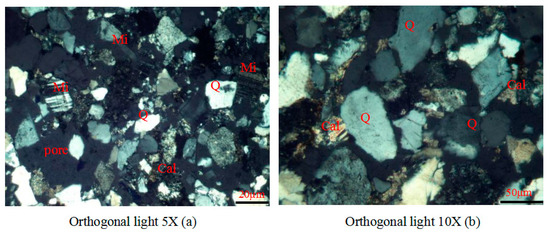 Microstructure of the medium-grained sandstone in the study region (Mi—microcline, Qz—quartz, Cal—calcite).